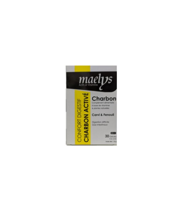 Le complément Alimentaire Maelys Charbon associe à la fois du charbon activé . du carvi et du fenouil .