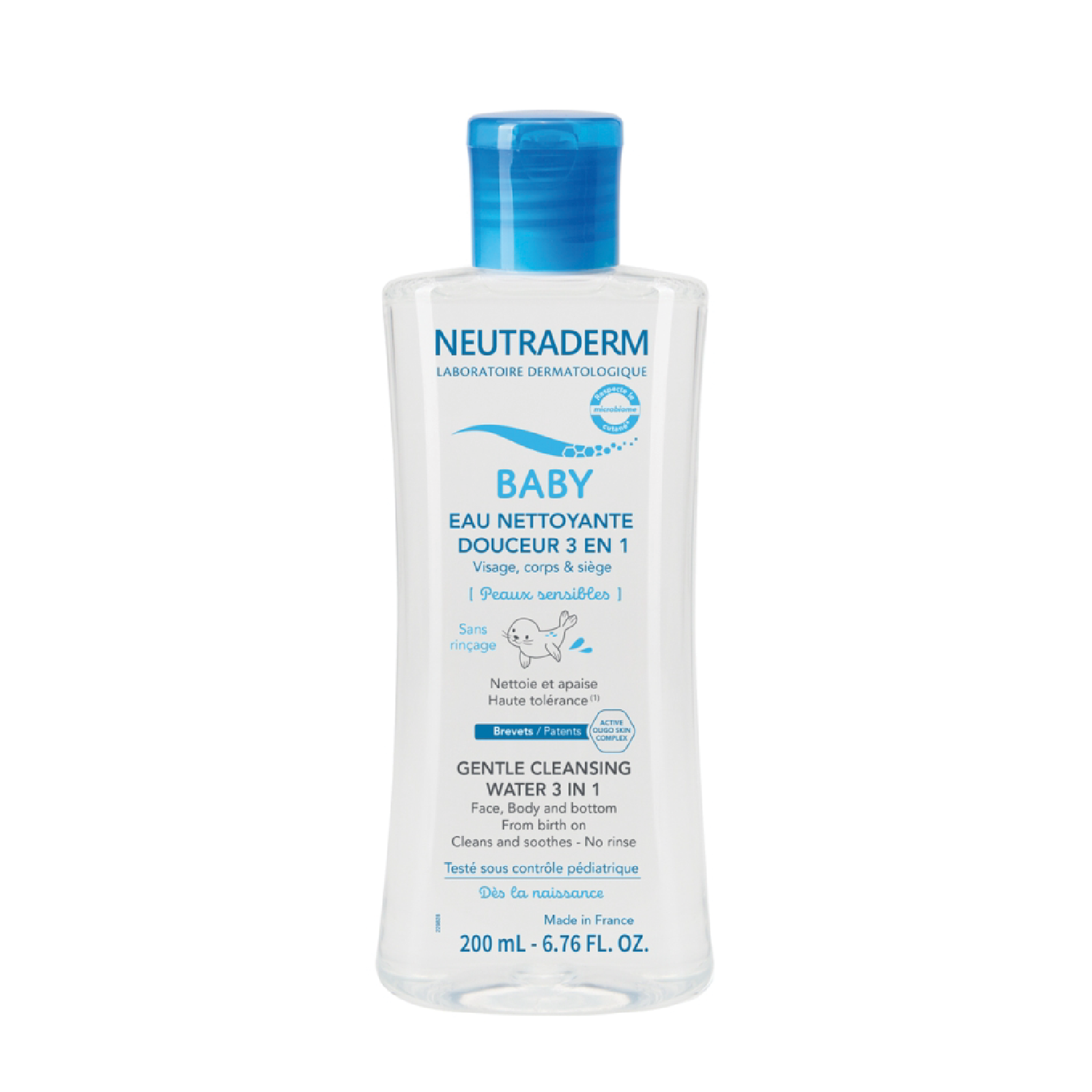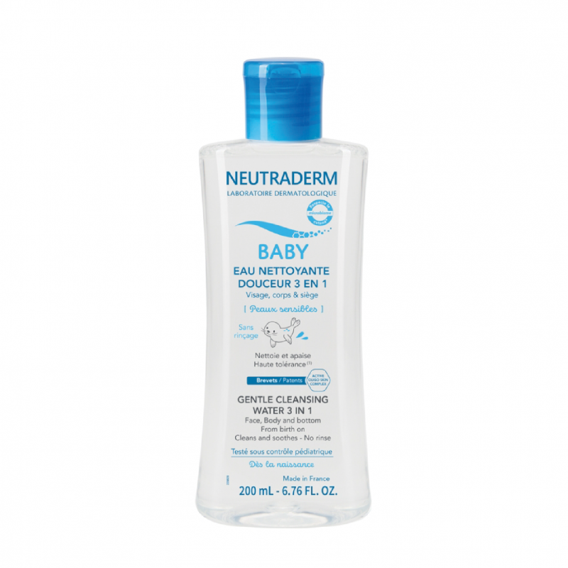 Neutraderm Baby Eau nettoyante douceur 3 en 1 est une eau qui permet de nettoyer tout en douceur le corps, le visage et le siège des bébés.