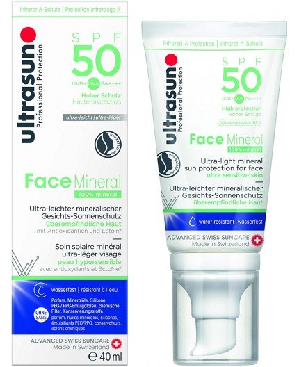 Ultrasun Mineral Face Crème Solaire SPF50 utilise uniquement des filtres physiques et ne contient ni parfum, ni émulsifiant, ni conservateur, ce qui en fait le choix idéal pour les peaux extrêmement sensibles